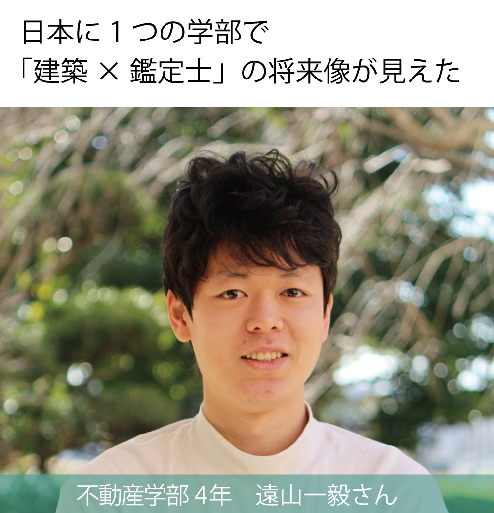 でも、不動産学部は「日本で一つの学部」ということや、「宅地建物取引士」の資格を取る万全のサポート体制があると知り、その資格が武器になるのではと思い、入学。無事に1年生のうちに宅地建物取引士に合格することができました。