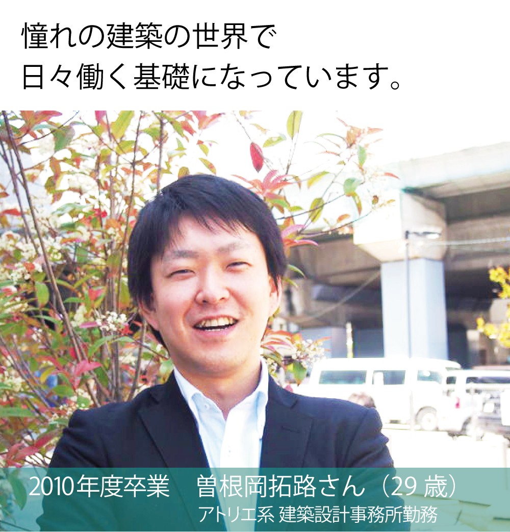 不動産学部では、法律、経済、経営、金融、建築、測量、施工など多くのことを学びましたが、その中でも建築物の歴史の奥深さと、巨匠達の素晴らしい作品の存在を知り、建築の分野に夢中になりました。そして自然と、未来へ作品を残すことができる建築の世界へ進みたいと思うようになり、卒業後、その希望を叶えることができました。